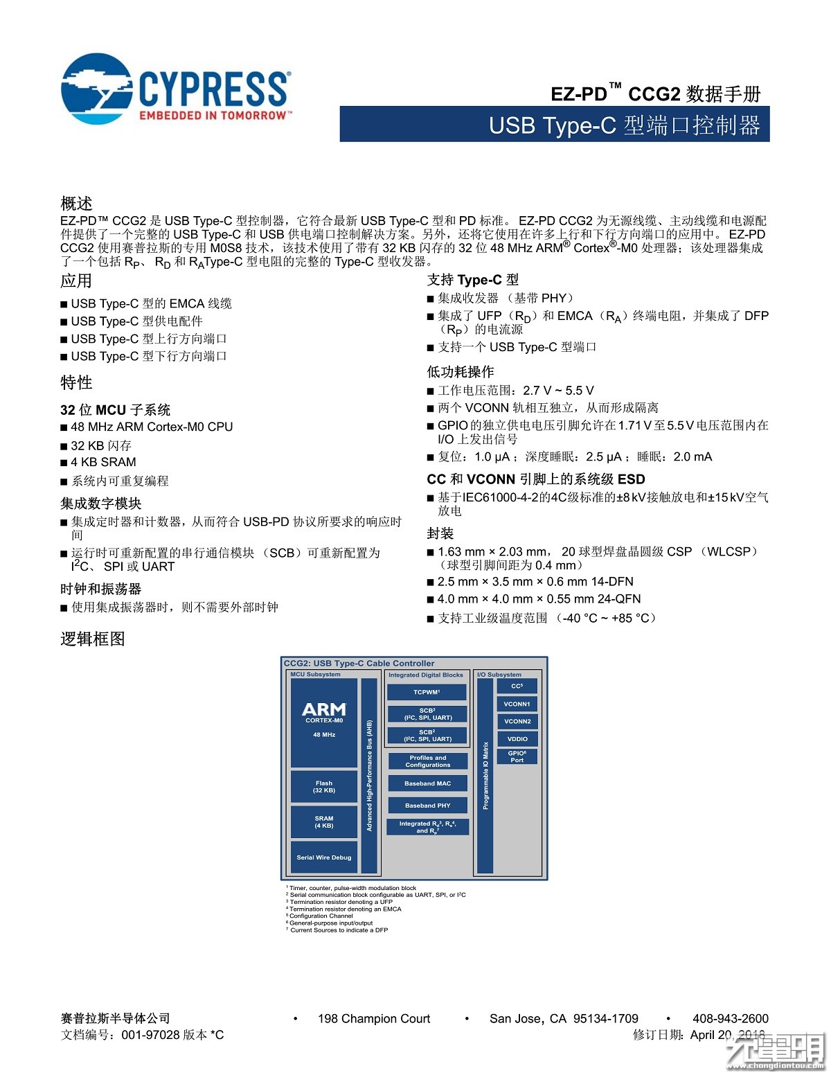 Cypress賽普拉斯CCG2是一款USB Type-C型控制器,它符合最新USB Type-C型和PD標(biāo)準(zhǔn),可為無源線纜、主動(dòng)線纜和電源配件提供了一個(gè)完整的USB Type-C和USB供電端口控制解決方案。另外,還可將它使用在許多上行和下行方向端口的應(yīng)用中。CCG2使用賽普拉斯的專用M0S8技術(shù),該技術(shù)使用了帶有 32 KB 閃存的 32 位 48 MHz ARM Cortex-M0 處理器;該處理器集成了一個(gè)包括 RP、RD和RA Type-C型電阻的完整的Type-C型收發(fā)器。 |