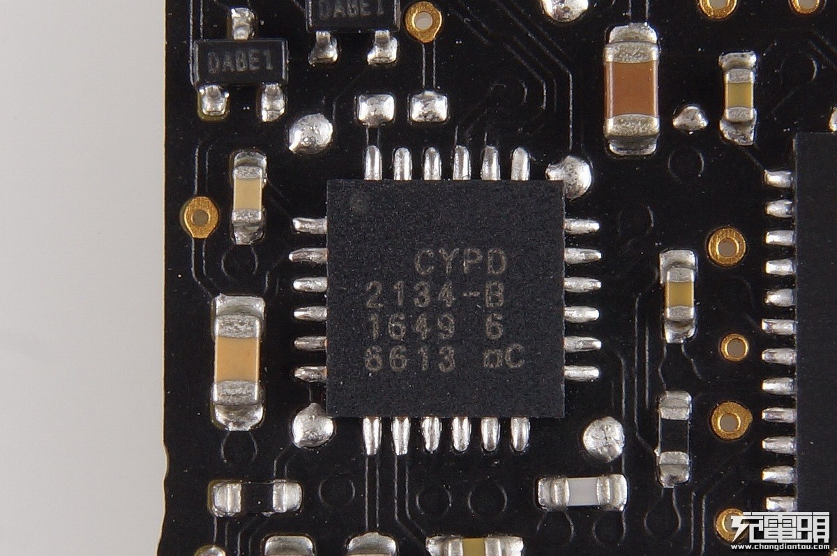 在充電頭網(wǎng)此前的拆解中,我們曾多次見到了一顆來自Cypress賽普拉斯的USB PD協(xié)議芯片CYPD2134。這也是市面是最早的一批USB PD控制器之一,其內(nèi)部型號為CCG2。據(jù)USB-IF公布數(shù)據(jù)顯示,這顆料早在2015年8月份就已經(jīng)取得了USB PD2.0認(rèn)證,TID號為1096047。
