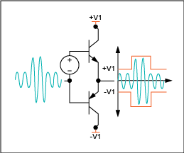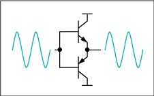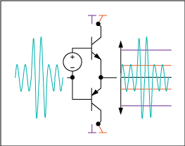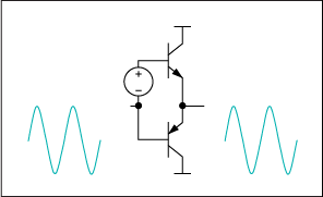 圖3. AB類放大器將兩個晶體管偏置,使其在信號接近零時能夠?qū)。所以這類放大器的效率比A類放大器高,失真比B類放大器小。