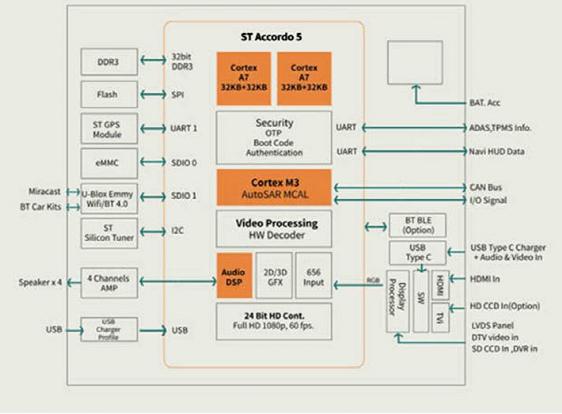 ST的Accordo 5(以下簡稱AC5)汽車處理器可實(shí)現(xiàn)駕駛者十分看重的實(shí)用功能,例如智能手機(jī)投屏可以讓駕駛者在車載顯示屏幕上安全查看或使用手機(jī)上的內(nèi)容,或音樂和導(dǎo)航服務(wù)。先進(jìn)的主處理器和高性能圖形及音視頻引擎可以實(shí)現(xiàn)復(fù)雜的資訊顯示功能,例如同時(shí)顯示使用者界面、倒車影像、導(dǎo)航地圖、視頻預(yù)覽。播放功能支持H.264和DivX®等主要視頻編碼格式,以及涉及圖形混合覆蓋等圖效處理的2D和3D圖形。新產(chǎn)品提供USB界面和SD存儲(chǔ)卡界面。