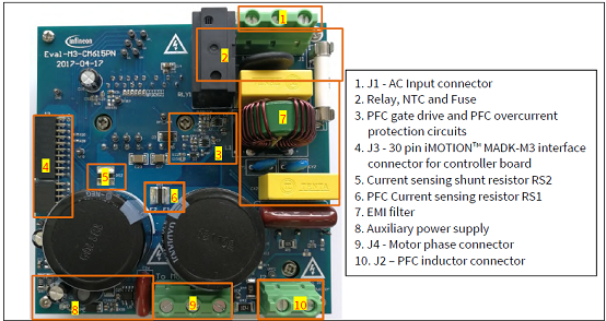 The Eval-M3-CM615PN evaluation power board is a part of the iMOTION™ Modular Application Design Kit formotor drives (iMOTION™ MADK). In order to run a motor, the matching control board is required to interfacethis power board.