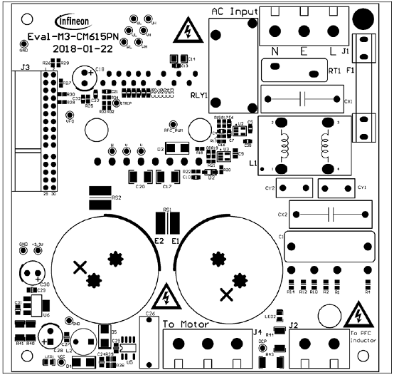 Eval-M3-CM615PN is an evaluation board for motor drive applications with single phase PFC integrated 3 phaseIPM. Combined in a kit with one of the available MADK control board options, it demonstrates Infineon’s motioncontrol IC and IPM technology for motor drives with single phase PFC.