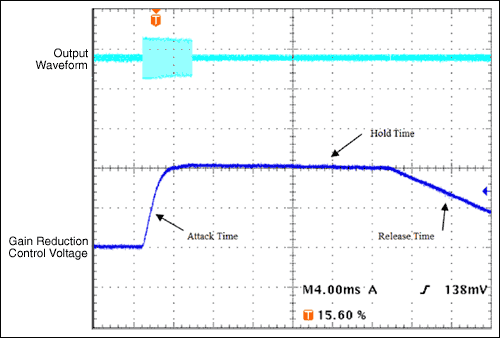 指信號(hào)落到門限電平以下后的延遲(釋放階段開始前)。保持時(shí)間不可調(diào);內(nèi)部設(shè)定為50ms。保持時(shí)間的設(shè)置是為了防止發(fā)生增益‘喘息’ (ALC響應(yīng)低頻分量的動(dòng)作能夠被聽到)。當(dāng)信號(hào)超過預(yù)設(shè)門限,重新進(jìn)入出動(dòng)階段時(shí),保持時(shí)間的作用被撤銷。