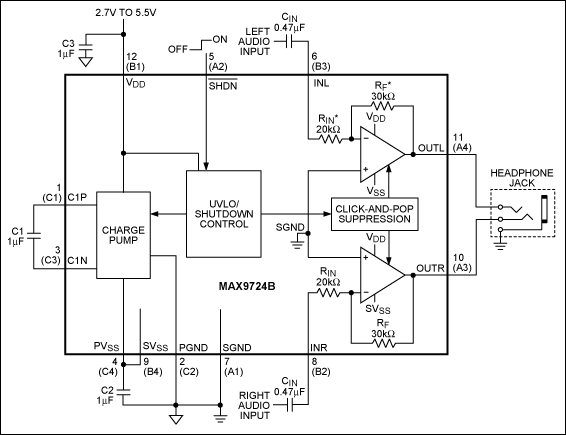 MAX9724/MAX9728耳機(jī)放大器通過正電源引腳產(chǎn)生內(nèi)部負(fù)電源。由于放大器的直流輸出偏置為0V,因此不需要輸出隔直流電容。內(nèi)部鎖定電路防止由于電源電壓過低或上電、斷電過程引起的偽操作,因此沒有雜音。由于放大器輸出電壓擺幅幾乎是單電源電壓的兩倍,因此還可以獲得其它優(yōu)點(diǎn),包括更大的信號(hào)擺幅以及更大的輸出功率。