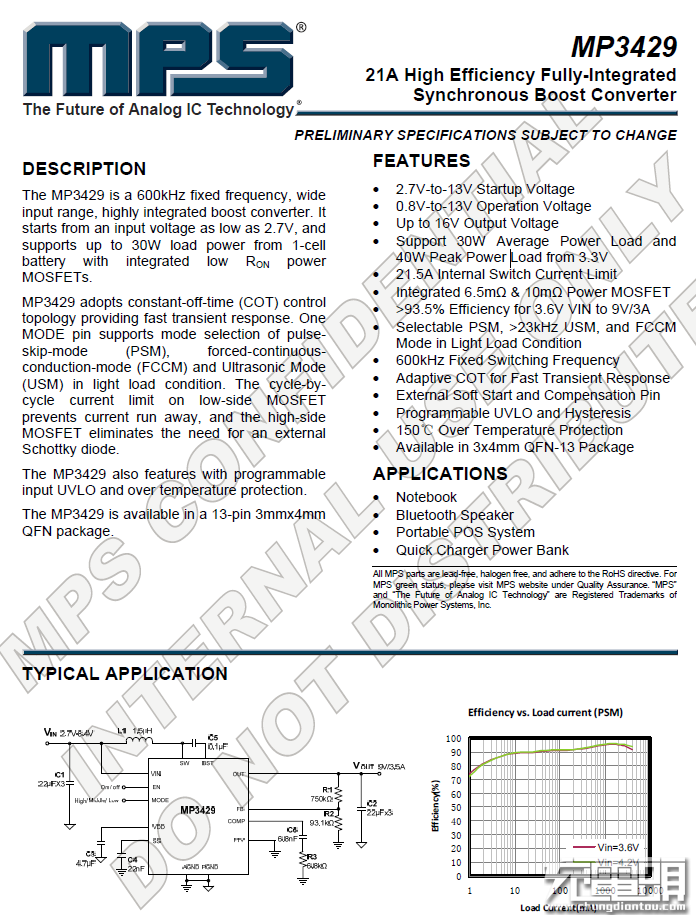 MPS(美國芯源半導(dǎo)體)此前推出的MP3428快充升壓方案后,開創(chuàng)了DC-DC升壓新方向,獲得市場認(rèn)可;但在客戶不斷追求設(shè)備小型化的趨勢下,內(nèi)置MOS成為市場趨勢,在收集市場客戶需求后,MPS最新推出了MP3429,這是一顆高度集成,寬輸入電壓,600KHz固定工作頻率的升壓芯片。它最低輸入電壓低至2.7V。得益于內(nèi)置低導(dǎo)阻功率MOSFET,在單節(jié)鋰電池供電時(shí),輸出功率可以達(dá)到30W?赏ㄟ^模式引腳選擇低負(fù)載時(shí)PSM/FCCM/USM工作狀態(tài)。低側(cè)MOSFET具有逐周期電流限制避免電流失控,并且高側(cè)MOSFET不再需要外接肖特基二極管。