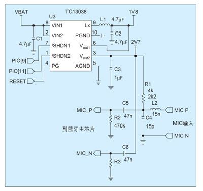 MOSFET,采用2MHz的開關(guān)頻率,轉(zhuǎn)換效率達(dá)到92%以上。高開關(guān)頻率和PWM/PFM自動(dòng)切換技術(shù)可使工程師選擇低至2.2μH的表貼電感和陶瓷電容,即可滿足濾波和藍(lán)牙芯片對(duì)紋波的要求。TC1303內(nèi)集成的LDO可提供300mA的輸出電流,且只有137mV電壓差。為了進(jìn)一步減小DC/DC開關(guān)噪聲對(duì)電路設(shè)計(jì)的影響,在芯片設(shè)計(jì)時(shí)將LDO的電源地引腳和DC/DC電源地引腳分開,保證了LDO輸出可以給I/O部分和麥克風(fēng)提供“干凈”的電壓。