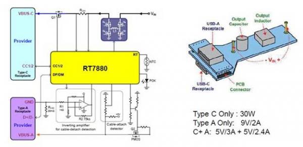 基于立锜科技(Richtek)RTQ7880的USB 1C1A智能功率分配及Type-C PD車載充電器解決方案。