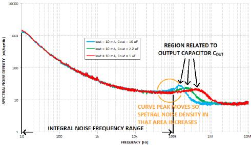 但是,如何表示LDO輸出的噪聲有多大呢?可用如上文所示的積分噪聲頻率范圍表示。這個(gè)范圍通常是10赫茲至100千赫。