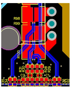 為了能夠準(zhǔn)確的采樣電流,應(yīng)將運(yùn)放芯片在PCB上的位置盡量靠近采樣電阻,同時(shí)又要使運(yùn)放芯片不能遠(yuǎn)離MCU,運(yùn)放的地和MCU的地應(yīng)該盡量靠攏。如圖3所示,采樣電阻(R98、R99、R100)兩端走差分線到運(yùn)放的同相和反相端口,差分線應(yīng)等距并且盡量短,以避免其他的干擾產(chǎn)生。壓縮機(jī)涉及到高壓和低壓部分,在布局電流地的時(shí)候,應(yīng)使大電流地和小電流地能很好的單點(diǎn)隔離。