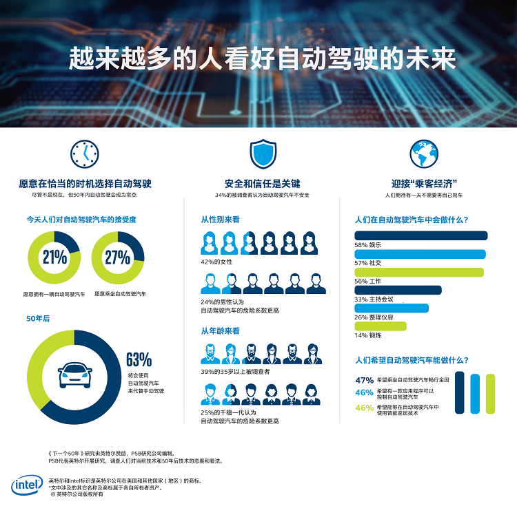 英特爾一項最新研究發(fā)現(xiàn),即使消費者現(xiàn)在仍然心懷擔憂并搖擺不定,但他們?nèi)詫ψ詣玉{駛汽車的未來滿懷期待。這項針對美國消費者的調(diào)查發(fā)現(xiàn),目前僅有21% 的美國人愿意改用自動駕駛汽車,但 63% 的被調(diào)查者認為今后的 50 年內(nèi)自動駕駛汽車將全面普及。這一未來愿景與早前英特爾的一項研究相吻合,英特爾預測,在 2050 年以前,以乘客為中心的未來產(chǎn)值將達到 7 萬億美元。
