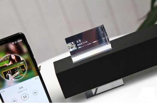 另外就是棱鏡的上半部分實際上是一個顯示屏,能夠顯示歌曲信息、專輯封面等信息,其實現(xiàn)方式和GoogleGlass類似,將顯示內容和現(xiàn)實背景疊加起來(AR),所以看起來會有一種信息漂浮起來的感覺。不過比較可惜的是,只有播放Gravityapp內置的音頻時,才能顯示歌曲和專輯封面信息,AirPlay或藍牙下只能顯示隨機線條圖案。