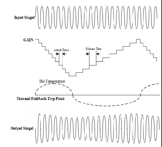 (1)隨著音樂的播放,當(dāng)PA因環(huán)境溫度增高、音樂平均功率上升引起溫度累積而板級散熱不足時(shí),PA結(jié)溫將逐漸升高,當(dāng)結(jié)溫高于自動(dòng)限溫點(diǎn)(Thermal Foldback Trip Point, TFB)時(shí),PA將以啟動(dòng)時(shí)間(Attack Time, tA) 的速率自動(dòng)減小增益,以減小PA功率耗散從而降低結(jié)溫。