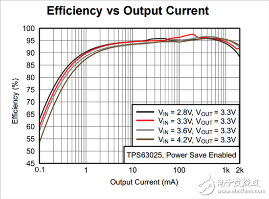 使用TPS63025 降壓-升壓轉(zhuǎn)換器系列可以在這些情況下提供更高效率。通過將效率大于95%的降壓轉(zhuǎn)換器與效率在90%以上的升壓轉(zhuǎn)換器組合在一起,基于不同的電池電壓,轉(zhuǎn)換效率可以達(dá)到95%或90%以上(請見圖1)。降壓-升壓轉(zhuǎn)換器不會對電源進(jìn)行雙轉(zhuǎn)換,而是按照需要,運(yùn)行為降壓或升壓轉(zhuǎn)換器。隨著效率的提高,溫度上升下降,并且增加了電池的運(yùn)行時間。