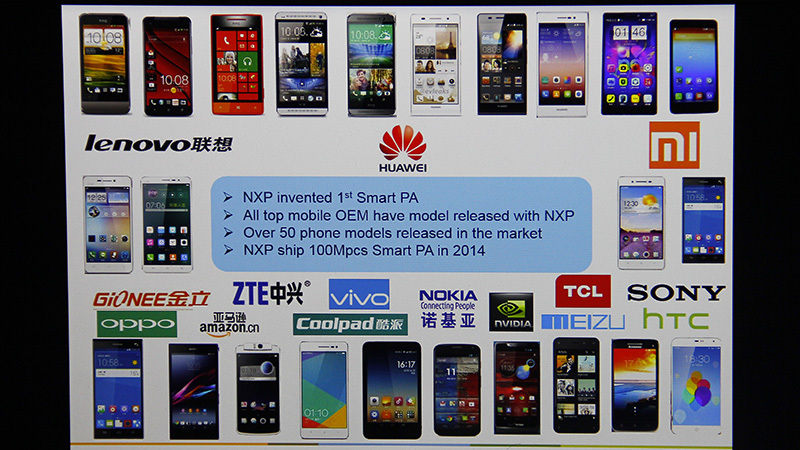 據(jù)Steve透露目前幾乎所有中國一線手機(jī)廠商大量旗艦機(jī)都采用了恩智浦的智能功放產(chǎn)品,2014年恩智浦功放出貨一億以上,包括小米、HTC、VIVO、聯(lián)想、華為、魅族、中興、金立、酷派等都在使用,有50款機(jī)型采用了這個智能功放。