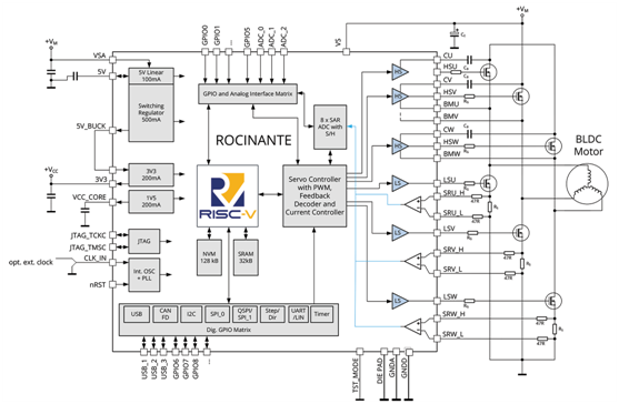 該組件也是世界上第一個(gè)在單一RISC-V中實(shí)現(xiàn)高壓技術(shù)的產(chǎn)品,可以實(shí)現(xiàn)能夠直接驅(qū)動(dòng)N溝道的MOSFETs進(jìn)而控制BLDC, 步進(jìn)電機(jī), 直流有刷電機(jī)以及音圈電機(jī)。