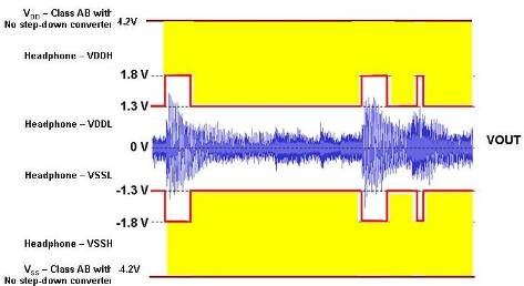 這種電源電壓為自適應(yīng)型。它在高音量音頻信號(hào)時(shí)升高,從而防止大峰值電壓失真,同時(shí)在小音頻峰值時(shí)下降來(lái)降低功耗。