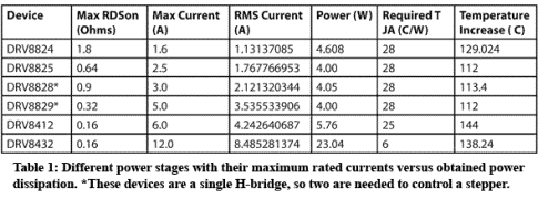 表 1 最大額定電流的不同功率級(jí)對(duì)比得到的功耗。這些器件均為單H橋,因此需要兩個(gè)來控制一個(gè)步進(jìn)馬達(dá)。
