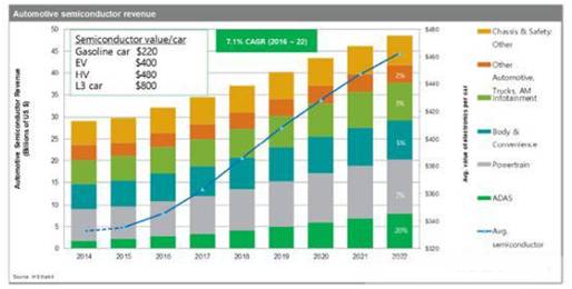據(jù)HIS Markit的預(yù)測,2016-2022年車載半導(dǎo)體的市場增長率是年平均7.1%,車載MCU的統(tǒng)合在穩(wěn)步發(fā)展,傳感器組合在多樣化地增長。