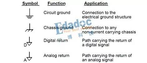 回到EMC培訓(xùn),Mark的觀點其實很清楚了,那就是地在PCB里是不存在的,它只是0v參考的符號象征。除非我們的設(shè)計或應(yīng)用在操作上需要區(qū)分數(shù)字和模擬電路,且需要將兩者彼此分割,或者需要從0v參考地區(qū)分不同的功能區(qū)域如機殼和ESD地,而且就算在同一系統(tǒng)里使用不同的地,在系統(tǒng)的某個地方也需要將這幾種不同的地連接起來,并且需要EMC工程師來保障相關(guān)的連接是否可行。除此之外其他的設(shè)計都建議大家使用一個地的符號來表示0v參考。下圖是幾個常見地的表示符號及功能應(yīng)用解釋,注意數(shù)字和模擬地用的是回流來形容而不是地。