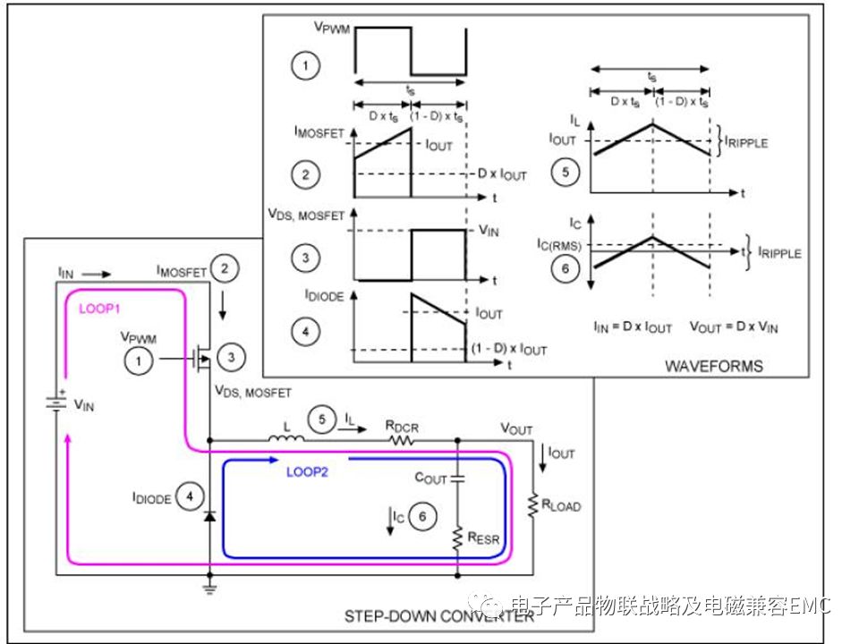 比如降壓型DC-DC/BUCK轉(zhuǎn)換器圖中標(biāo)示了各點(diǎn)(1-6處)的開關(guān)波形,通過波形數(shù)據(jù)也可進(jìn)行理論和實(shí)際的分析