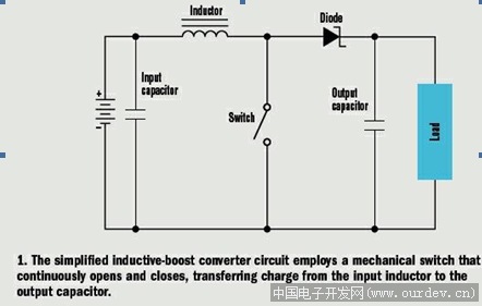 如圖1所示為簡化的電感型DC-DC轉換器電路,閉合開關會引起通過電感的電流增加。打開開關會促使電流通過二極管流向輸出電容。因儲存來自電感的電流,多個開關周期以后輸出電容的電壓升高,結果輸出電壓高于輸入電壓。