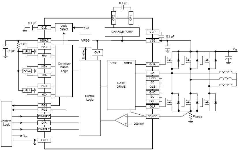 當配備噪音過濾以防止錯誤整流信號時,可采用價格低廉的霍爾元件。A4931 可提供 7.5 V 穩(wěn)壓電源,以向三個霍爾元件供電。