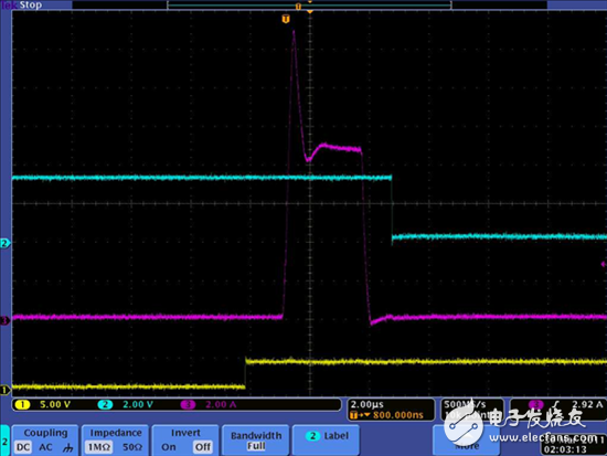 圖3中的波形顯示的是電機(jī)驅(qū)動(dòng)器輸出在短路期間的典型OCP事件。黃色痕跡是輸入信號(hào),藍(lán)色痕跡是故障輸出信號(hào),而粉色痕跡是流經(jīng)輸出級(jí)的電流。開(kāi)始時(shí),電流快速上升。在短暫過(guò)沖后(這個(gè)過(guò)沖不對(duì)輸出級(jí)產(chǎn)生影響),電流被一個(gè)模擬電流限值限制在大約9A。在大約2.5µs時(shí)間后,OCP抗尖峰脈沖定時(shí)器到期,而電流暫時(shí)停留在9A的模擬電流限值上,這個(gè)值超過(guò)了OCP限值。在這個(gè)器件上,OCP電平大約為3A。在這個(gè)點(diǎn)上,輸出級(jí)被禁用,電流下降到0值,故障出現(xiàn)。