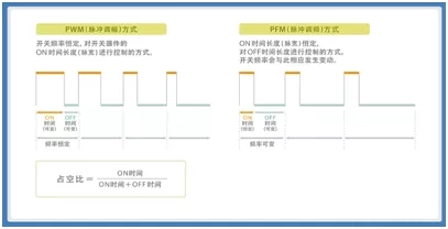 圖2:PWM(脈沖調(diào)幅)方式與PFM(脈沖調(diào)頻)方式