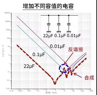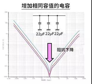 并聯(lián)的電容容值是相加的,所以3個(gè)電容為66µF,容性區(qū)域的阻抗下降。