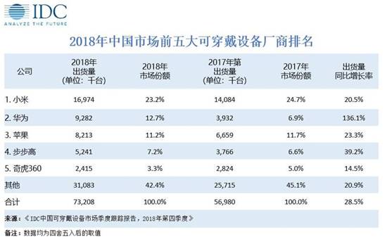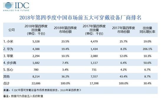 IDC《中國可穿戴設(shè)備市場季度跟蹤報告,2018年第四季度》顯示,2018年第四季度中國可穿戴設(shè)備市場出貨量為2269萬臺,同比增長 30.4%;A(chǔ)可穿戴設(shè)備(不支持第三方應(yīng)用的可穿戴設(shè)備)同比增長25.0%,其中主要的增長來自于耳機(jī)產(chǎn)品,而智能可穿戴設(shè)備同比增長達(dá)到64.5%。