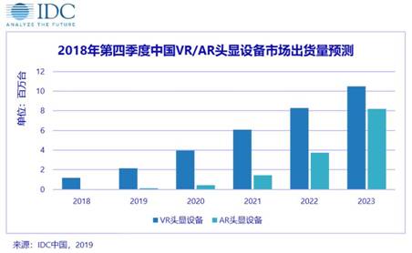 國(guó)際數(shù)據(jù)公司(IDC)最新發(fā)布的《中國(guó)VR/AR市場(chǎng)季度跟蹤報(bào)告》顯示,2018年國(guó)內(nèi)頭顯設(shè)備市場(chǎng)總出貨量延續(xù)增長(zhǎng)態(tài)勢(shì),其中AR以及VR頭顯設(shè)備出貨量分別達(dá)到3.2萬(wàn)臺(tái)以及116.8萬(wàn)臺(tái),桌面頭顯以及獨(dú)立頭顯設(shè)備市場(chǎng)保持快速發(fā)展,無(wú)屏頭顯形態(tài)逐漸失去市場(chǎng)主導(dǎo)地位。IDC預(yù)測(cè),到2023年中國(guó)VR頭顯設(shè)備出貨量將突破1050.1萬(wàn)臺(tái),AR頭顯設(shè)備出貨量將達(dá)到821.4萬(wàn)臺(tái),未來(lái)5年整體市場(chǎng)年復(fù)合增長(zhǎng)率(CAGR)為69.9%。