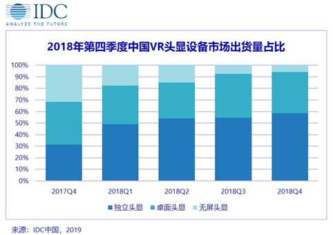 國(guó)內(nèi)VR獨(dú)立頭顯市場(chǎng)在2018年繼續(xù)高速增長(zhǎng),一舉超過(guò)桌面頭顯以及無(wú)屏頭顯成為出貨量最高的產(chǎn)品形態(tài),增幅達(dá)到123.6%。未來(lái)包括6自由度追蹤以及Inside-out空間定位等技術(shù)的融入將會(huì)極大豐富獨(dú)立頭顯的應(yīng)用場(chǎng)景,提升用戶在使用過(guò)程中的交互體驗(yàn)。同時(shí),由于用戶群體對(duì)于VR設(shè)備的認(rèn)知逐漸提高等因素,體驗(yàn)相對(duì)落后的VR無(wú)屏頭顯市場(chǎng)在2018年大幅萎縮,同比去年下降達(dá)到71.3%。VR終端市場(chǎng)逐漸向擁有更佳體驗(yàn)的中高端產(chǎn)品形態(tài)過(guò)渡,隨著頭部廠商集中將在2019年帶來(lái)桌面頭顯以及獨(dú)立頭顯的迭代版本,行業(yè)生態(tài)將得到更全面快速的發(fā)展。
