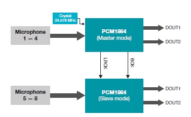 在采用多麥克風(fēng)設(shè)計(jì)和語(yǔ)音識(shí)別時(shí),我們也無(wú)需重新設(shè)計(jì);赑CM1864 的TI 圓形麥克風(fēng)板(CMB) 參考設(shè)計(jì)(如圖 3 所示)使用兩個(gè)4通道音頻ADC 與一組模擬麥克風(fēng)(最多含八個(gè))連接,并且可以在嘈雜的環(huán)境中提取清晰的用戶語(yǔ)音指令。