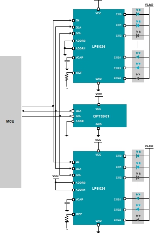 如圖 6 所示,各種LED 環(huán)形燈照明圖案參考設(shè)計(jì)說(shuō)明了如何使用裝有集成式LED 引擎的新型多通道RGB LED 驅(qū)動(dòng)器設(shè)計(jì)多色RGB LED 環(huán)形燈圖形子系統(tǒng)。使用環(huán)境光傳感器 IC 可自動(dòng)控制LED 亮度。