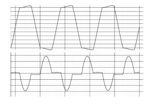 圖1:無功率因數(shù)校正SMPS的典型線電壓(上圖)和電流波形(下圖)。