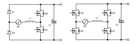 已經(jīng)采用線路同步MOSFET代替橋式二極管的方案,這種方案比較昂貴,并且需要專用的自供電控制器。業(yè)界已經(jīng)認(rèn)識(shí)到一種更好的解決方案是將主開關(guān)也用作同步整流器,其中器件溝道被配置為僅從源極到漏極導(dǎo)通,這就是所謂“無橋圖騰柱”配置。如圖3(左)所示,通過重新排列組件能夠?qū)崿F(xiàn)這種配置。D5用類似Q1的開關(guān)代替,現(xiàn)在Q1和Q2用作升壓開關(guān),同步整流器通過交流電源極性而實(shí)現(xiàn)交換功能。在這種配置中,只有一個(gè)二極管和開關(guān)的RDS(on)形成電流串聯(lián),從而顯著降低了傳導(dǎo)損耗。