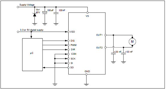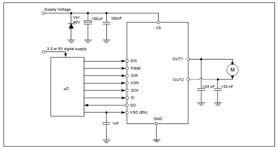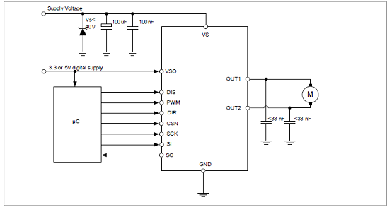 圖2.IFX9201SG帶SPI接口的H橋應(yīng)用電路圖