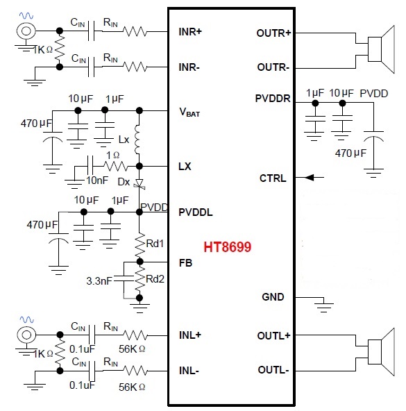 HT8699能通過一個主控IO口實現(xiàn)關(guān)斷、開啟、D類/AB類、防破音開啟/關(guān)閉等各種模式的切換,節(jié)省藍牙主控的資源,外圍簡單。