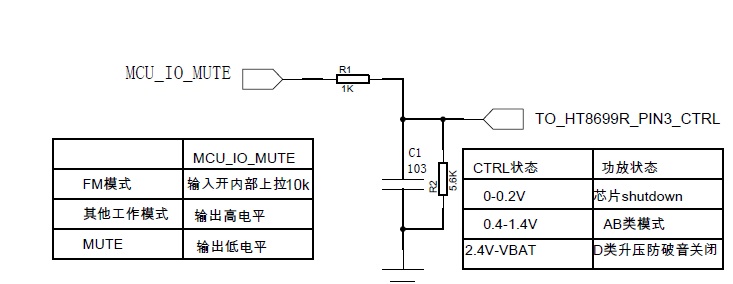 HT8691R能通過一個(gè)主控IO口實(shí)現(xiàn)關(guān)斷、開啟、D類/AB類、防破音開啟/關(guān)閉等各種模式的切換,節(jié)省藍(lán)牙主控的資源,外圍簡單。