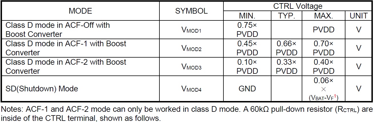 HT8691R 在CTRL端輸入不同電壓值,能實(shí)現(xiàn)4種工作模式,詳見下表。