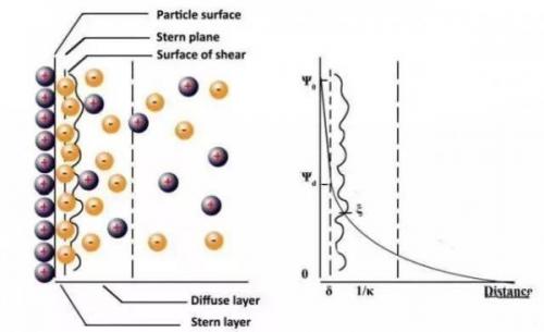 下圖為Stern雙電層模型,zeta電位(ξ,Zeta potential)為雙電層模型中極重要的參數(shù),實(shí)際測量時并無法直接測得粒子的表面電位,但可由聲波法或是電泳法計算出粒子的zeta電位。雙電層模型中Stern 層與擴(kuò)散層間的剪切平面上存在zeta電位。