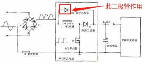 綜上所述,以上電路中二極管D2的作用是在開(kāi)機(jī)瞬間或負(fù)載短路、PFC輸出電壓低于輸入電壓的非正常狀況下給電容提供充電路徑,防止PFC電感磁飽和對(duì)PFCMOS管造成的危險(xiǎn),同時(shí)也減輕了PFC電感和升壓二極管的負(fù)擔(dān),起到保護(hù)作用。該二極管的作用仍然可以說(shuō)是減少浪涌電壓的沖擊,但主要是為了減少浪涌電壓對(duì)開(kāi)關(guān)管造成的威脅,對(duì)升壓二極管也有分流保護(hù)作用,而不是保護(hù)濾波電容的。在開(kāi)機(jī)正常工作以后,由于D2右面為B+PFC輸出電壓,電壓比左面高,D2呈反偏截止?fàn)顟B(tài),對(duì)電路的工作沒(méi)有影響,D2可選用可承受較大浪涌電流的普通大電流的整流二極管。