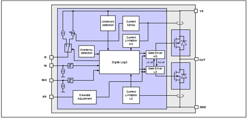 圖3. IFX007T應(yīng)用電路:IFX007T(負(fù)載接地)組成半橋