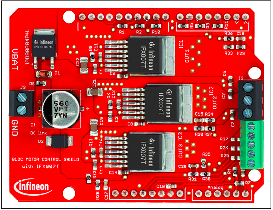 The Motor Control Shield adds powerful motor control to the Arduino projects. The shield can be controlledwith the general logic IO-Ports of a microcontroller. Either an Arduino Uno or the XMC1100 Boot Kit fromInfineon can be used as the master.On board of the Motor Control Shield are three IFX007T NovalithICTM. Each is featuring one P-channel high sideMOSFET and one N-channel low side MOSFET with an integrated driver IC in one package. Due to the P-channelhigh side switch a charge pump is not needed.