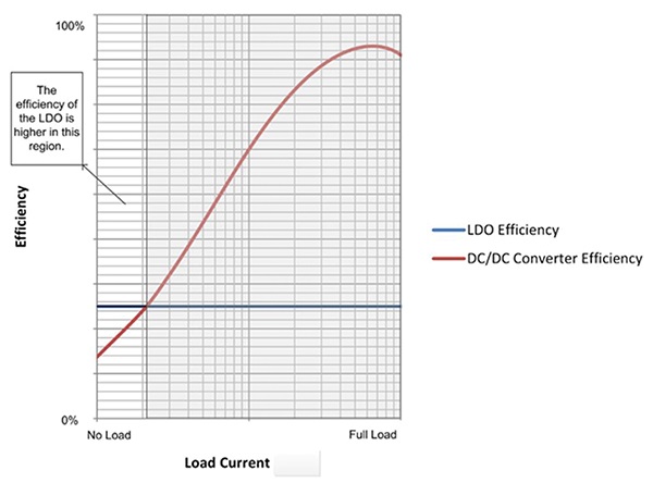 圖2給出了低IQ LDO效率曲線的一般示例,該效率曲線用DC/DC轉(zhuǎn)換器的效率曲線繪制,用于更高的電壓轉(zhuǎn)換(即12 V至1 V)。在輕負載時,LDO更有效。如果系統(tǒng)在輕負載下花費大量時間,使用LDO來調(diào)節(jié)電壓可以顯著提高系統(tǒng)總效率。