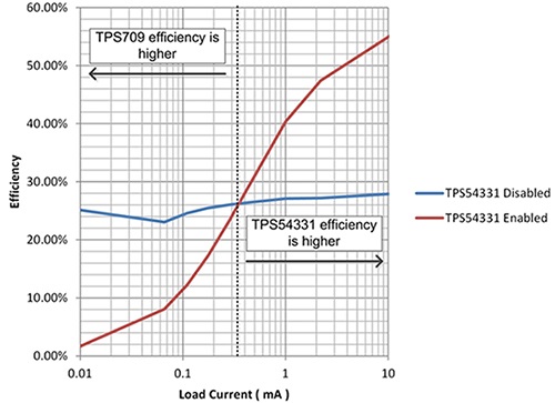 盡可能請注意,從10μA負載電流到10 mA,TPS709的效率將保持大致恒定在27%(VOUT/VIN)。當TPS54331使能時,由于空載輸入電流,它將以非常低的效率啟動,但很快就會升高,在較高的負載電流下達到90%以上。當TPS54331使能時,TPS709不提供任何負載電流,因此可以忽略其接地電流。由此可以清楚地看出,當輸出負載電流為350μA或更低時禁用TPS54331將是有益的。