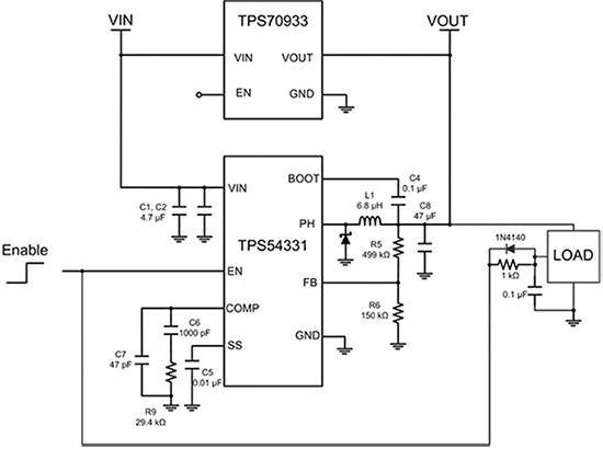 如果設計人員能夠在負載為負載時禁用DC/DC轉(zhuǎn)換器,則可以采用并行使用這兩種方法的簡單方法。最小,即對用于負載的轉(zhuǎn)換器使用相同的啟用/禁用信號。圖1中可以看到一個例子。