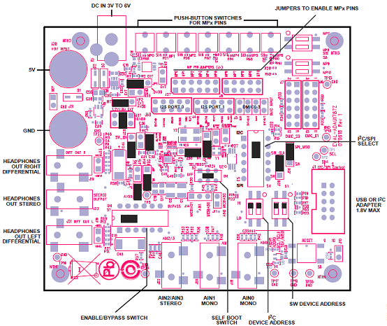 圖4.評(píng)估板EVAL-ADAU1787Z PCB跳線和開(kāi)關(guān)設(shè)定圖