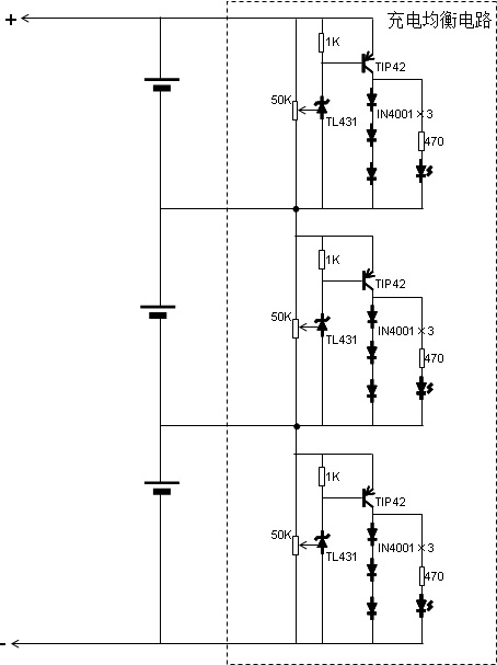 這個均衡電路用的是三個一模一樣的并聯(lián)穩(wěn)壓電路組成的,每個電池上并一個。