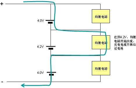 每個穩(wěn)壓電源都調(diào)節(jié)到4.2V。均衡的原理是,當(dāng)電池電壓都小于4.2V時,并聯(lián)穩(wěn)壓電路不起作用,充電電流都從電池上通過: